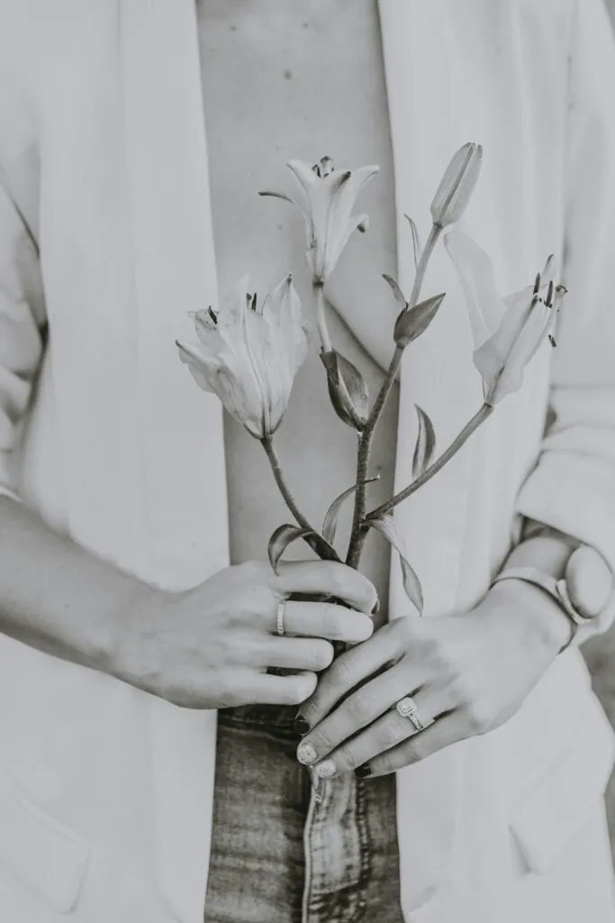 Grayscale photo of a person holding a flower